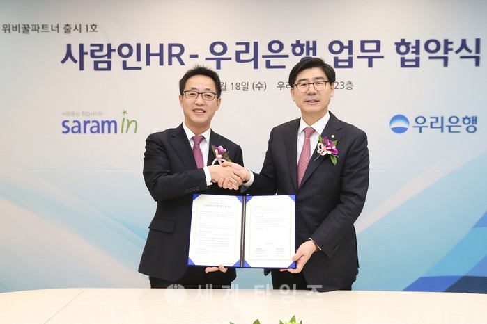 ‘사람인HR’은 이용자 중심의 매칭기술을 기반으로 기업과 구직자를 연결하는 우리나라 대표 리크루팅 포털 운영사이다. 사람인HR은 위비꿀파트너 서비스를 통해 공채 등 취업정보를 구직자에게 제공하며, 우리은행은 사람인HR 서비스로 취업에 성공한 고객에게 전용 금융상품을 제공할 예정이다.