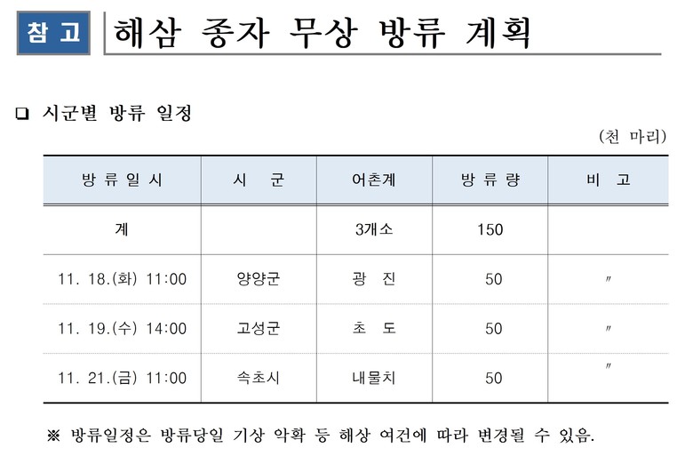 [강원도 세계타임즈=김민석 기자] 강원특별자치도(도지사 김진태)는 11월 18일부터 21일까지 속초 내물치, 고성 초도, 양양 광진 등 동해안 3개 시군 마을해역에 해삼 15만 마리를 무상 방류할 계획이라고 밝혔다.