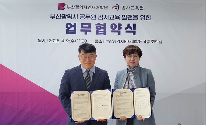 [부산 세계타임즈=이용우 기자] 부산광역시인재개발원(원장 김은희)과 감사교육원(원장 김순식)은 어제(9일) 시 인재개발원에서 「부산시 공무원의 감사 역량 강화를 위한 교육 분야 업무협약(MOU)」을 체결했다고 밝혔다.