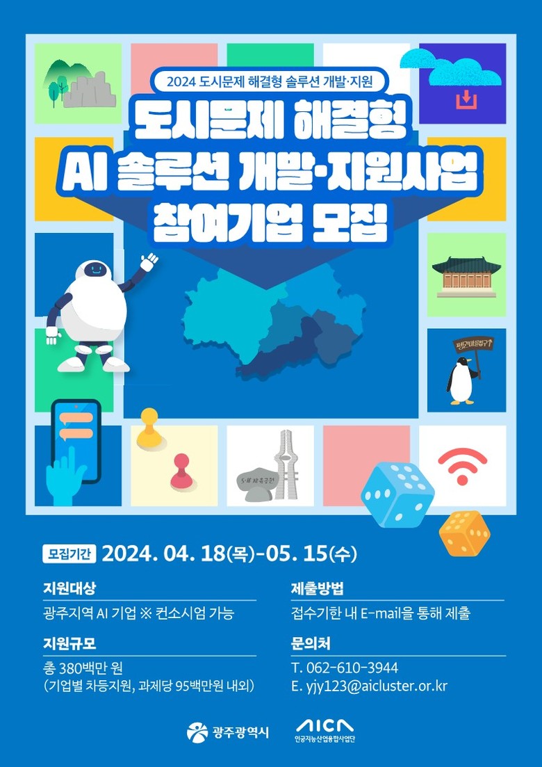 올해 ‘도시문제 해결형 AI 솔루션 지원사업’에 참여를 희망하는 광주지역 인공지능기업은 오는 5월 15일까지 인공지능산업융합사업단 누리집(http://aica-gj.kr)을 통해 지원하면 된다.