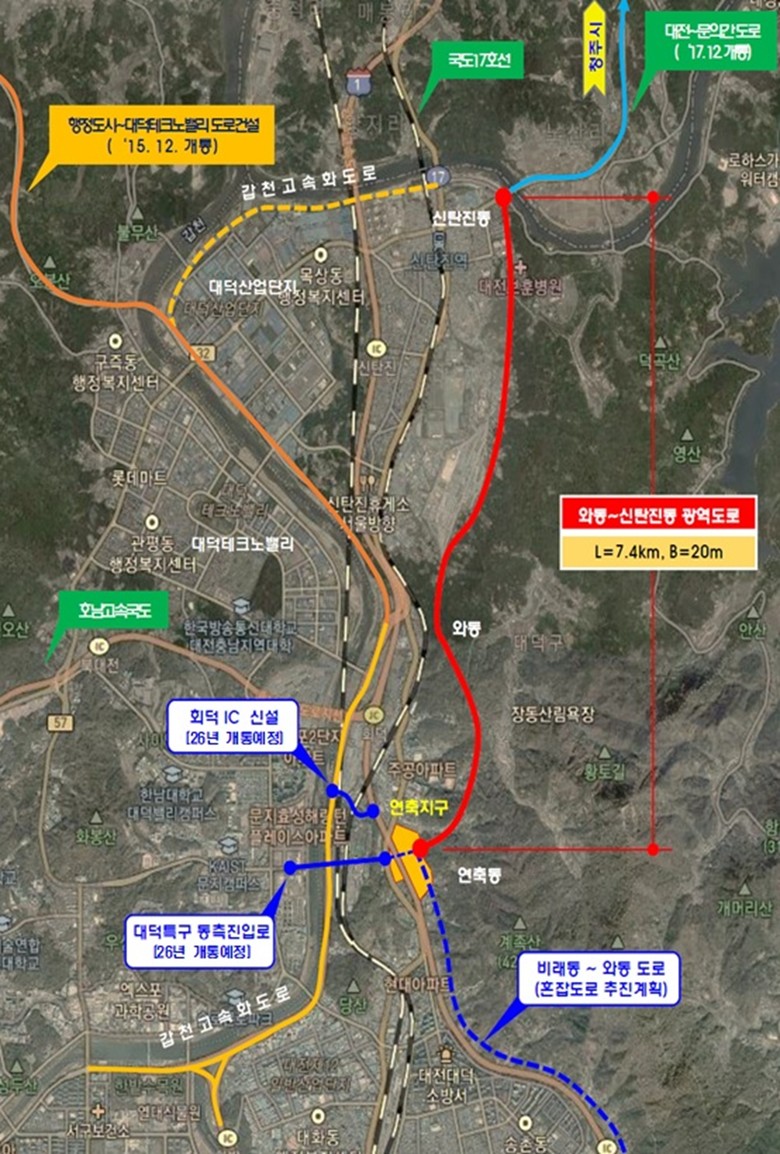 ‘와동~신탄진동 도로개설사업’은 연장 7.4km, 폭 20m, 왕복 4차로 규모로, 총사업비는 2,033억 원이며, 2035년 준공을 목표로 단계적으로 추진될 예정이다.