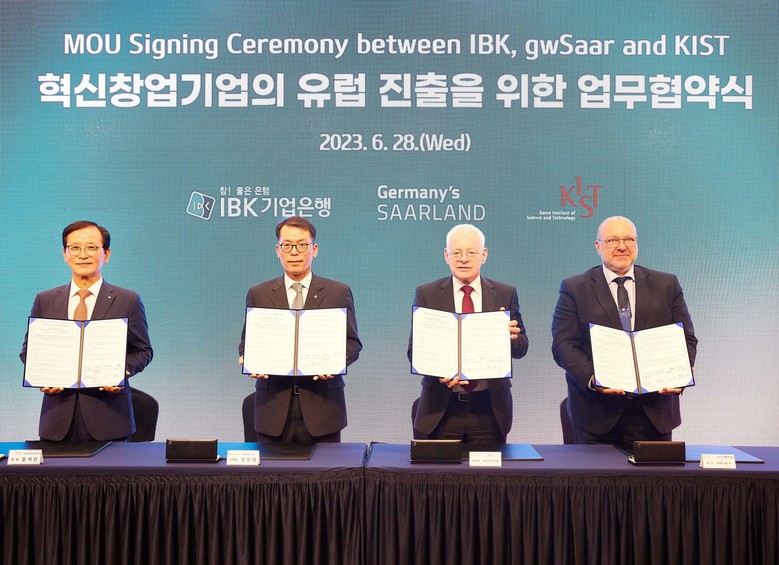 또한 행사에 앞서 IBK기업은행은 독일 잘란트(Saarland) 주 정부(부총리 위르겐 바르케), 한국과학기술연구원(KIST, 원장 윤석진)과 ‘혁신창업기업의 유럽진출 지원’을 위한 다자간 업무협약을 체결했다.