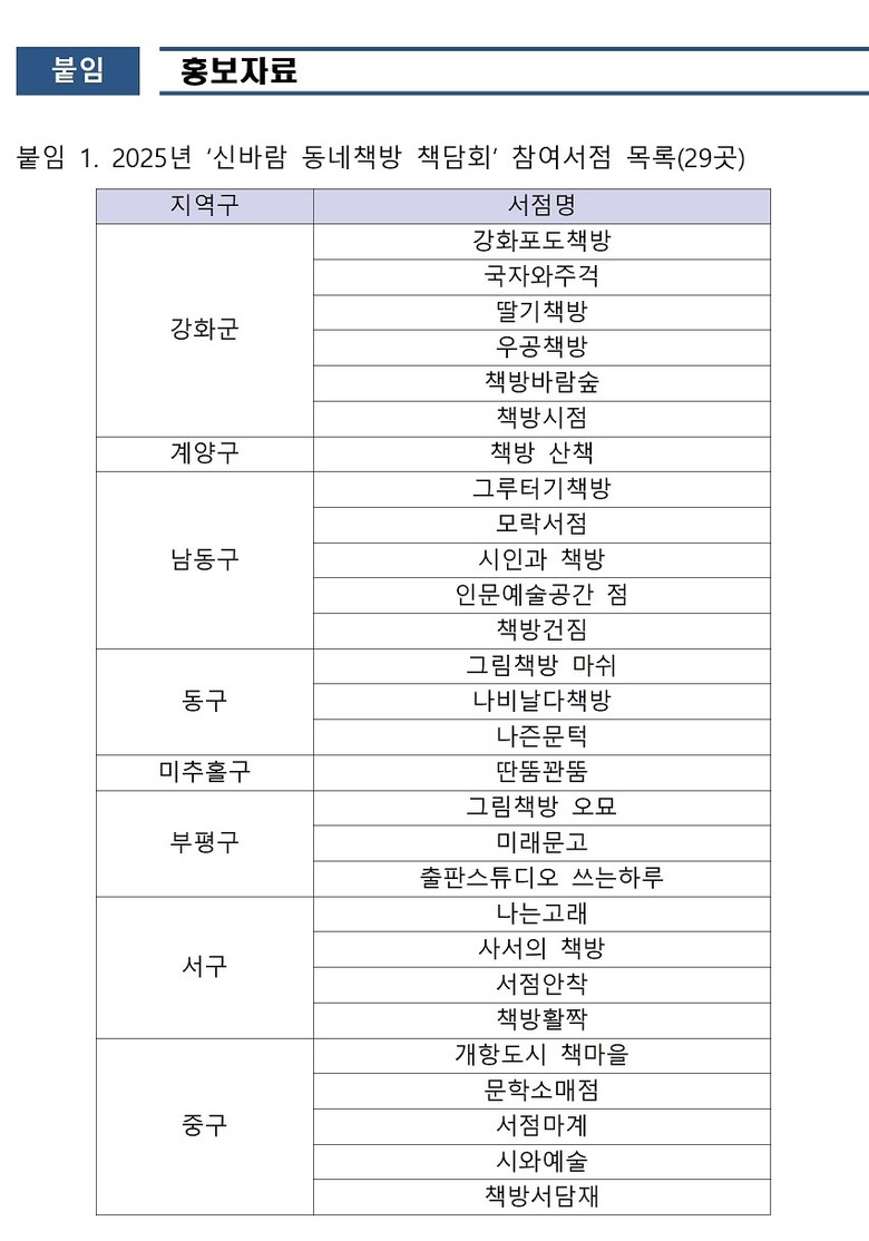 참여를 희망하는 시민은 책담회를 주최하는 각 동네책방의 SNS를 통해 신청할 수 있으며, 세부 일정과 참여 서점 정보는 인천문화재단 홈페이지 공지사항에서 확인할 수 있다.