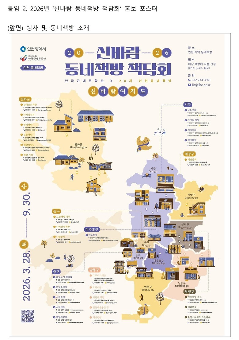 ○ 3월 28일(토)부터 9월 30일(수)까지 6개월간 인천 전역에서 진행 [인천 세계타임즈=심하린 기자] 인천문화재단(대표이사 이종관) 한국근대문학관이 인천 동네책방과 함께하는 2026년 <신바람 동네책방 책담회>를 개최한다. 이번 행사는 3월 28일(토)부터 9월 30일(수)까지 약 6개월 동안 진행되며, 인천 동네책방 28곳에서 총 68회의 책담회가 운영된다.