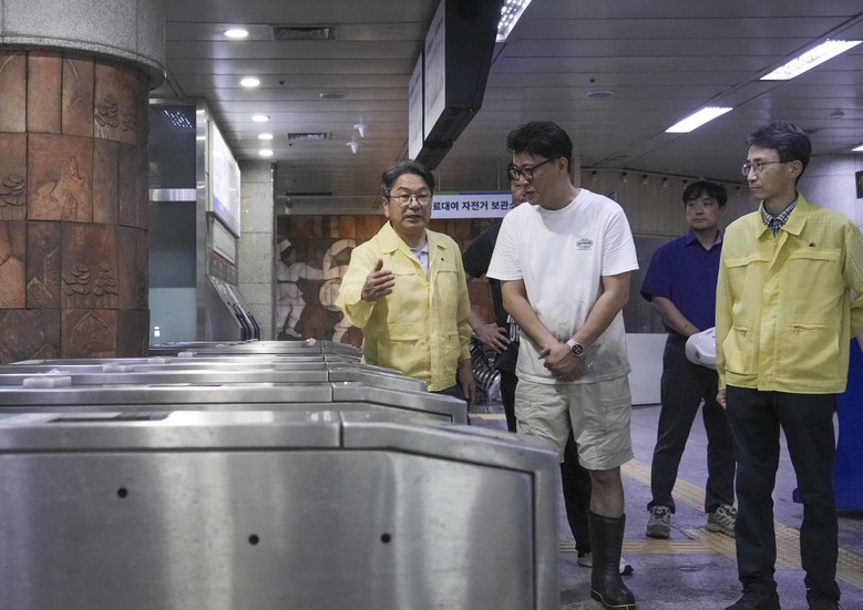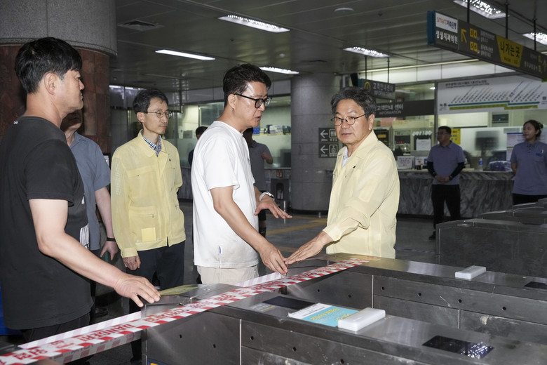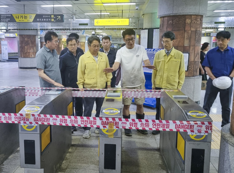 [광주 세계타임즈=손권일 기자] 강기정 광주광역시장이 18일 오전 폭우로 침수 피해를 입은 광주지하철 1호선 상무역을 찾아 피해 복구 상황을 점검하고 있다. 긴급 복구를 마친 광주지하철은 전 구간 정상운행에 들어갔다./광주광역시 제공