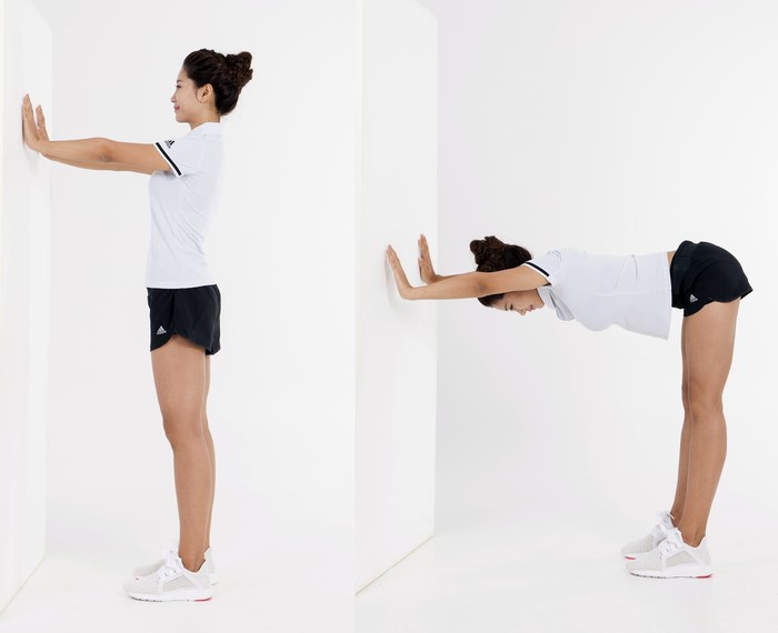 ‘기역자 스트레칭’은 하체뿐만 아니라 허리, 어깨까지 전신을 이완시킬 수 있는 전신 스트레칭 동작이다. 먼저 벽을 1m 정도 앞에 두고 다리와 양손을 어깨너비 정도로 벌린다. 상체를 천천히 숙여 벽을 짚는다. 무릎을 편 채 어깨와 허리를 허벅지에 당기는 느낌이 들 때까지 아래로 눌러준다. 제자리로 돌아온 후 같은 동작을 5회 반복한다.