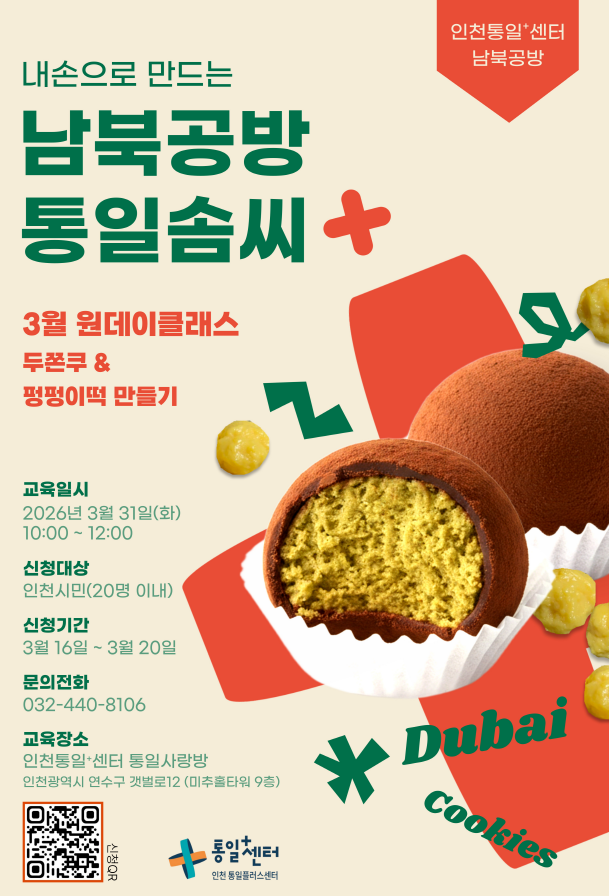 참가자 모집은 시 홍보매체와 인천통일플러스센터 사회관계망서비스(SNS) 및 블로그를 통해 공지하며 제1차 남북한 간식문화 <두쫀쿠&펑펑이떡 만들기> 클래스는 현재 신청 접수 중이다.