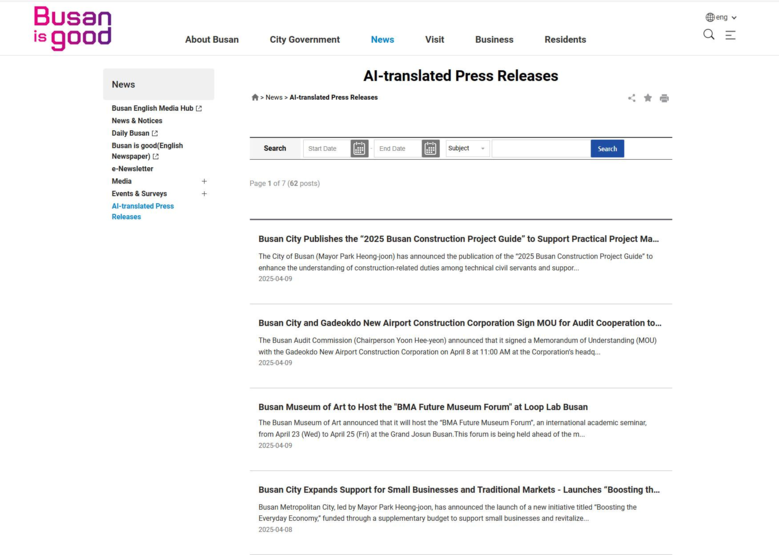 영문 보도자료는 시 영문 누리집(www.busan.go.kr/eng) 내 '인공지능 번역 보도자료(AI-translated Press Releases)' 메뉴에서 확인할 수 있다.
