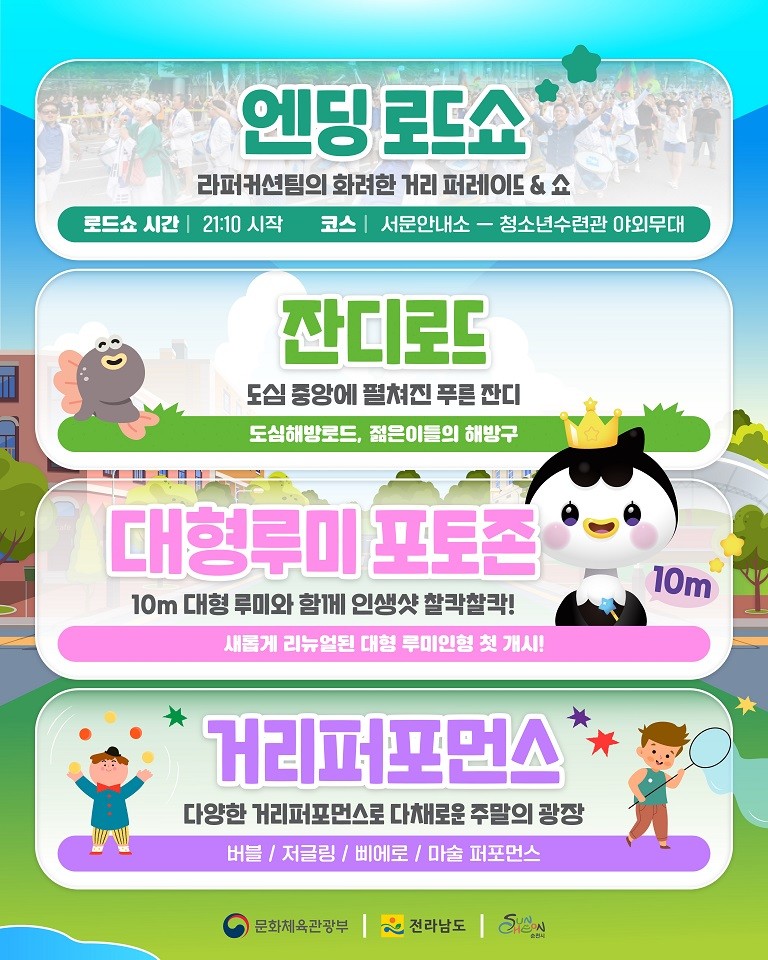 - 잔디로드, 10M 대형 루미 인형 포토존, 물총 서바이벌까지 다양한 프로그램 준비 [순천시 세계타임즈=우덕현 기자] 순천시(시장 노관규)가 오는 15일부터 16일까지 문화의 거리 일원에서 ‘도심 해방로드, 주말의 광장(젊은이들의 해방구)’을 개최한다고 밝혔다.