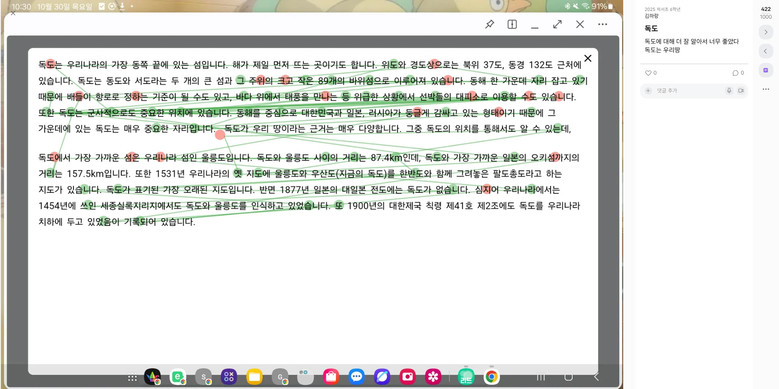 한편, 백진우 교사는 경기도교육연구원과 미국 오클라호마대학교 공동연구를 통해 제공받은 리드포스쿨(Lead4School)을 활용해 AI 기반 독도 독서 활동을 운영하였다. 학생들은 독도의 역사와 자연환경에 관한 글을 읽고 AI 피드백을 받으며 학습한 뒤, AI 마음일기(심스페이스)에 감상과 생각을 기록하고 페들렛(Padlet)에 공유하며 성찰적 사고와 공감 능력을 길렀다.