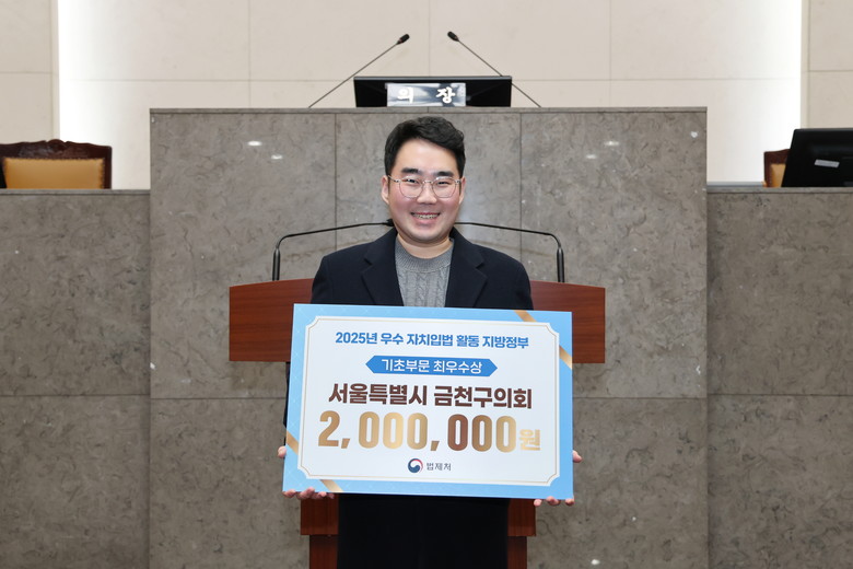[금천구 세계타임즈=이장성 기자] 서울특별시 금천구의회가 18일 법제처가 주관한 ‘2025년도 우수 자치입법 활동 지방정부’ 선정에서 기초부문 최우수상을 수상했다. 이번 수상은 고영찬 금천구의원이 발의한 ‘청소년 건강·위생용품 지원 조례’가 우수조례로 선정된 데 따른 것으로, 금천구의회 출범 이후 최초의 법제처 최우수상이라는 점에서 의미가 크다.
