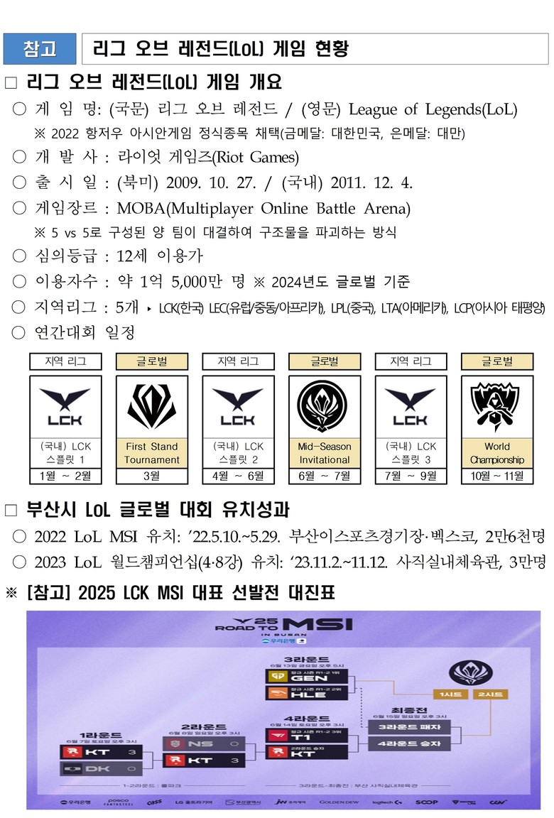 리그 오브 레전드 챔피언스 코리아(LCK)는 매일 약 400만 명이 시청하며, 절반 이상이 해외 시청자일 정도로 글로벌 프리미엄 콘텐츠로 자리매김해 있다. 이번 대회에 국내외 팬들의 관심이 부산으로 집중돼 이스포츠 성지 부산의 입지를 더욱 굳건히 할 것으로 예상된다.