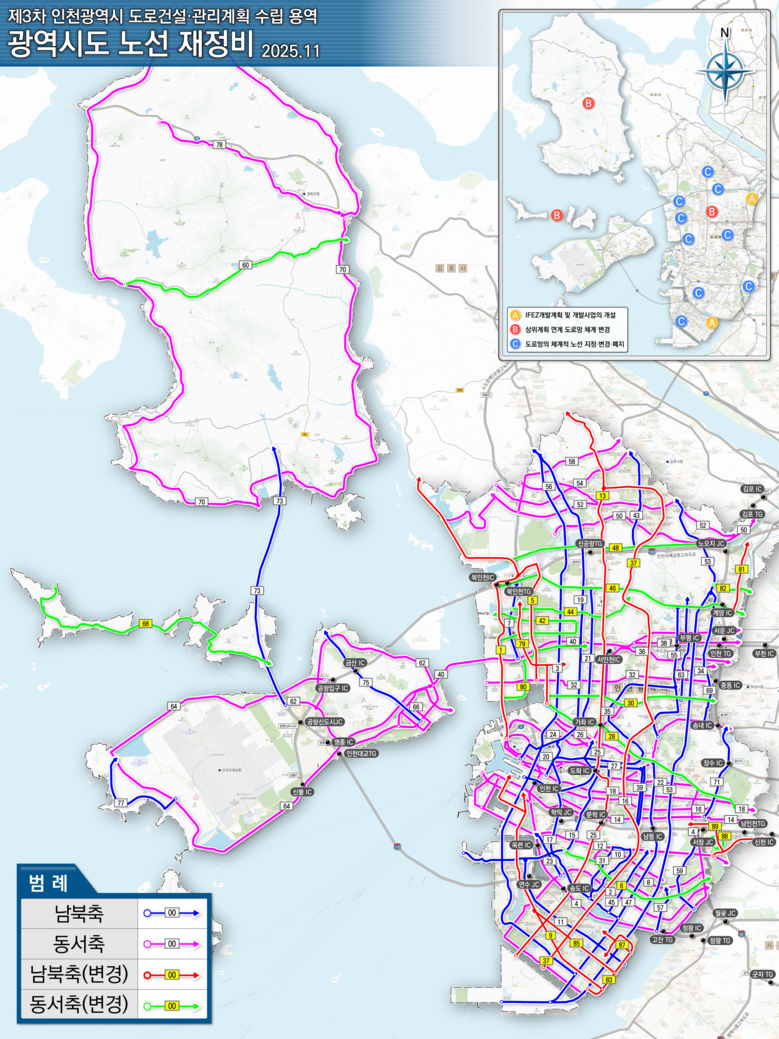 【신설】10개 +53km,【변경】13개 +5km,【폐지】2개 -18km [인천 세계타임즈=심하린 기자] 인천광역시(시장 유정복)는 12월 22일 송도·청라경제자유구역 및 계양 테크노밸리(TV) 개발계획, 고속도로 건설 및 교통혼잡도로 개선사업계획 등 국가 상위계획을 반영해 광역시도 노선 체계를 재정비하여 고시한다고 밝혔다.