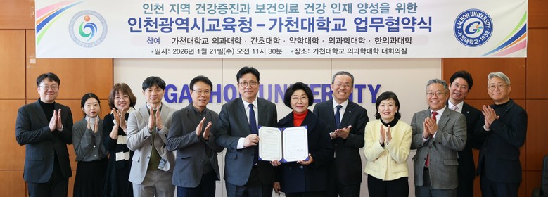 ‘가천의료융합교육 및 연구협의체’는 가천대학교 의과·간호·약학·의과학·한의학 대학 등 5개 단과대학으로 구성된 교육·연구 협의체로, 이번 협약은 인천시교육청과 가천대학교가 지역 기반 의료융합교육 협력체계를 구축하여 지역사회 건강 증진과 보건·의료 인재 양성에 기여하고자 추진됐다.