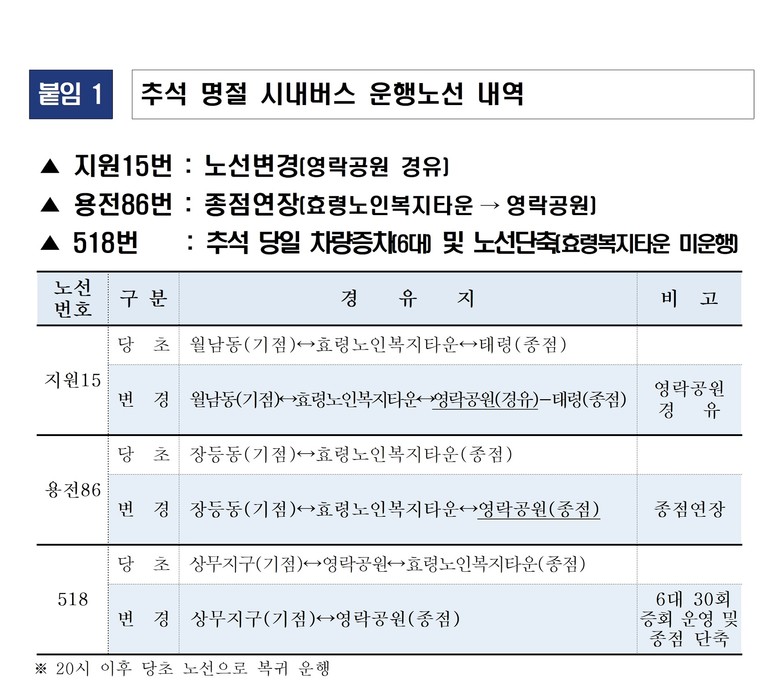 상무지구∼광주종합버스터미널∼영락공원을 운행하는 ‘518번’ 시내버스는 추석 당일(17일)에 30회 증차해 운행하고, 월남동~태령을 운행하는 ‘지원15번’ 시내버스는 영락공원을 경유한다. 효령노인복지타운이 종점인 ‘용전86번’ 시내버스는 영락공원까지 연장 운행하는 등 시내버스 노선을 조정해 성묘객의 이동을 지원한다.