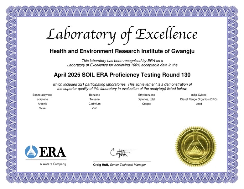 광주보건환경연구원은 이번 평가에서 금속류와 유기물질 등 총 12개 항목에 참여, 모든 항목에서 최고 등급인 ‘만족(Satisfactory)’ 판정을 받아 국제 기준에 부합하는 정밀 분석 능력을 공식 인정받았다.