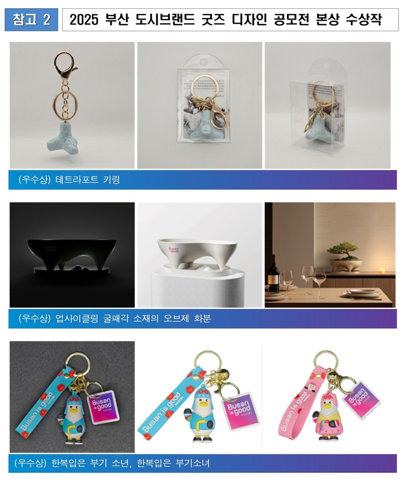 이 외에도 ▲‘부산이즈굿(busan is good)’ 오브제 화분 ▲테트라포트 열쇠고리(키링) ▲한복 입은 ‘부기’ 열쇠고리(키링) 등 작품성이 돋보이는 상품이 우수상으로 뽑혔다.