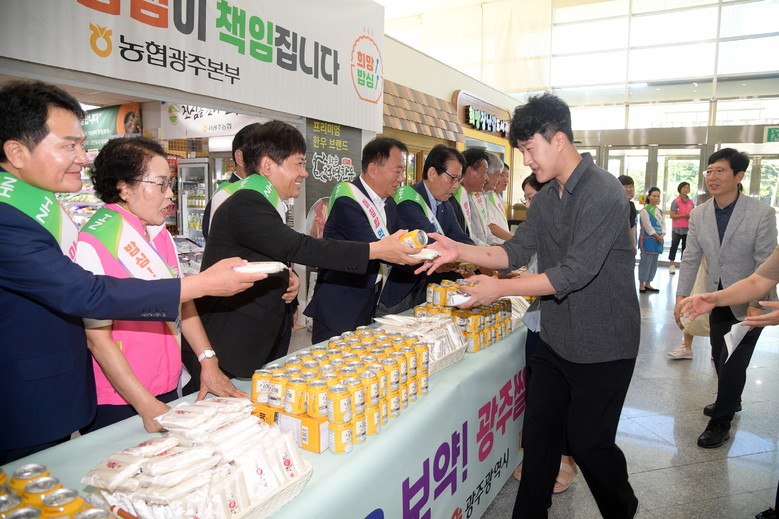 [광주 세계타임즈=손권일 기자] 이상갑 광주광역시 문화경제부시장이 29일 오전 시청사 입구에서 열린 광주쌀 소비촉진을 위한 아침밥 먹기 캠페인에 참석해 참석자들과 함께 기념촬영을 한 후 출근하는 직원들에게 가래떡 나눔을 하고 있다. /광주광역시 제공