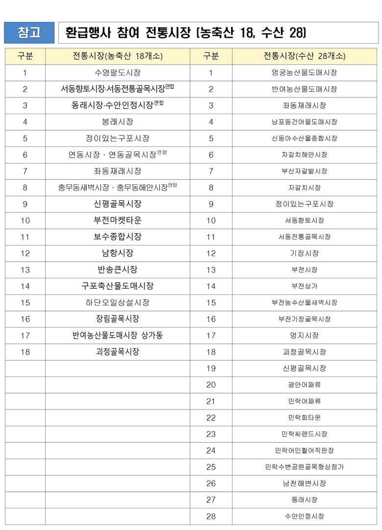 10월 1~5일, 전통시장(농축산 18곳, 수산 28곳)에서 ‘추석맞이 농축수산물 환급행사’를 열어 국산 신선 농축산물 구매 시 최대 30퍼센트(%) 온누리상품권 환급 혜택을 제공한다.