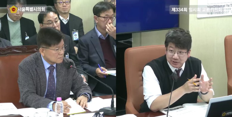 | ▲ 서울시의회 교통위원회 회의 중 한국영 서울시설공돤 이사장(좌) 문성호 서울시의원(우) |