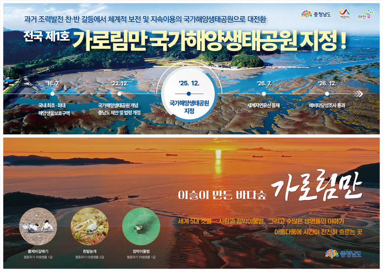 전상욱 국장은 “가로림만 둘레를 연결하는 갯벌생태길 조성, 전국 최초 갯벌 생태마을인 중왕·왕산마을 등 기존 사업과도 연계해 추진하겠다”며 “제1호 국가해양생태공원 지정을 계기로 사업을 속도감 있게 추진해 해양생태거점으로 나아갈 것”이라고 강조했다.