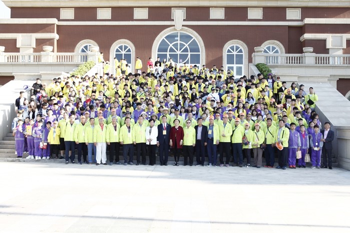 | ▲2018 한중 꿈나무 체육활동 한마음대회에서 참가자들과 중국 연태애화쌍어국제학교 학생들이 기념 촬영을 하고 있다. |