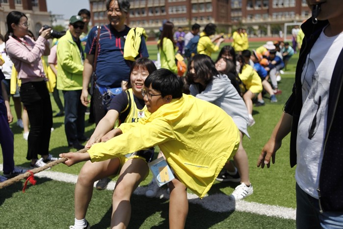 | ▲2018 제2회 한중 꿈나무 체육활동 한마음대회의 체육교류 중 줄다리기를 하는 모습. |