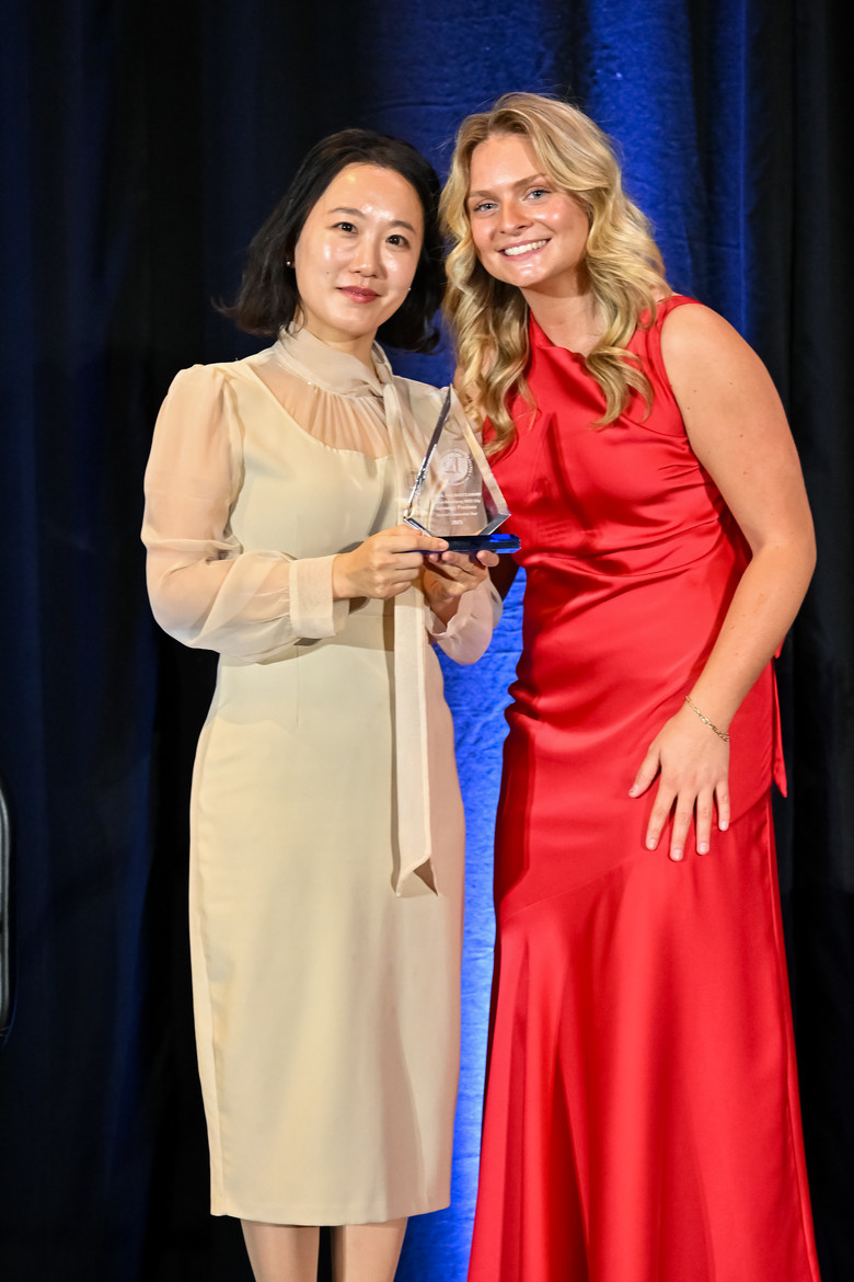 | ▲글로벌 트래블러 테스티드 어워즈 수상 모습.(왼쪽부터 경기관광공사 글로벌마케팅팀 이아란 과장, Megan Gragg, 글로벌 트레블러 Account Executive(영업담당).[사진=경기관광공사] |