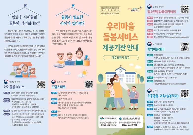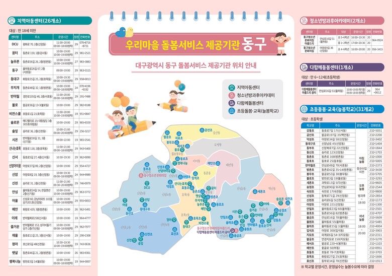 안내지도에는 동구, 수성구, 중구 등 자치구별로 ▲초등돌봄·교육(늘봄학교), ▲지역아동센터, ▲청소년방과후아카데미, ▲다함께돌봄센터 등 다양한 돌봄서비스 제공 기관의 운영 현황을 체계적으로 정리했다. 학교에서 학부모 상담이나 돌봄 연계 시 참고할 수 있도록 현장 활용성을 높인 자료로 제작되었다.