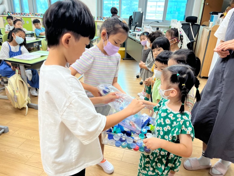 이번 여름방학 환경지킴이 미션은 유치원과 가정·초등학교가 연계하여 실천하였다. 여름방학 환경지킴이 미션을 통해 유치원에 다니는 동생과 초등학교에 다니는 형님이 함께 유치원과 가정에서 버려지는 병뚜껑을 모아보았다.