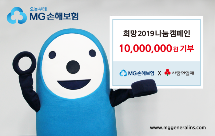 [세계타임즈 이채봉 기자]MG손해보험(대표이사 김동주, )이 연말을 맞아 28일 ‘희망2019나눔캠페인’에 1천만 원의 성금을 기부했다.