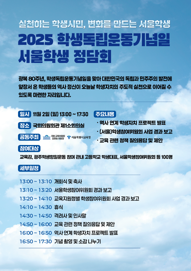 이번 행사는 광복 80주년과 학생독립운동기념일(11.3.)을 맞아, 학생독립운동의 역사적 의미를 바탕으로 학생자치와 민주시민의 가치를 확산하고 서울교육 방향을 함께 모색하기 위해 마련되었다.