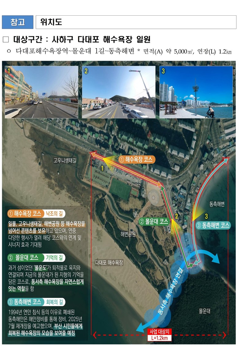 지난 5월 30일부터 6월 18일까지 대상지 공모를 진행한 결과 총 4개 자치구의 5개 후보지가 접수됐으며, 지난 6월 27일 개최된 선정위원회 심사를 거쳐 '다대포 해수욕장 일원'이 최종 대상지로 선정됐다.