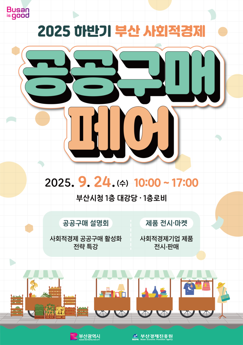 ◈ 시, 사회적경제기업의 자생력 강화와 제품 판로 확대를 위해 지속 노력 예정 [부산 세계타임즈=이용우 기자] 부산시(시장 박형준)는 내일(24일) 오전 10시 시청 1층 대강당과 로비에서 「2025 하반기 부산 사회적경제 공공구매 페어」를 개최한다고 밝혔다.