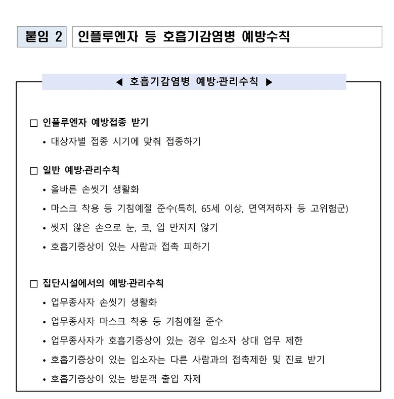 - 손씻기·기침예절 등 호흡기감염병 예방수칙 준수 당부