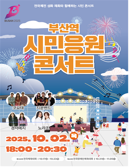 콘서트에는 ▲부산 인기 밴드 ‘지운밴드’ ▲여성 듀오 ‘경서예지’ ▲2인조 록 듀오 ‘노라조’ ▲혼성 그룹 ‘코요태’가 참여한다.