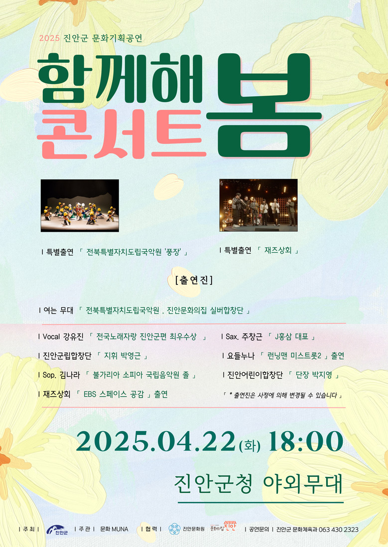 김종길 문화체육과장은 “세대를 아우르고 장르를 넘나드는 이번 ‘함께해·봄’ 콘서트를 통해 군민 모두가 즐기고 공감하는 따뜻한 봄밤이 되기를 바라며, 문화예술로 하나되는 자리에 많은 군민 여러분의 관심과 참여를 부탁드린다”고 전했다.