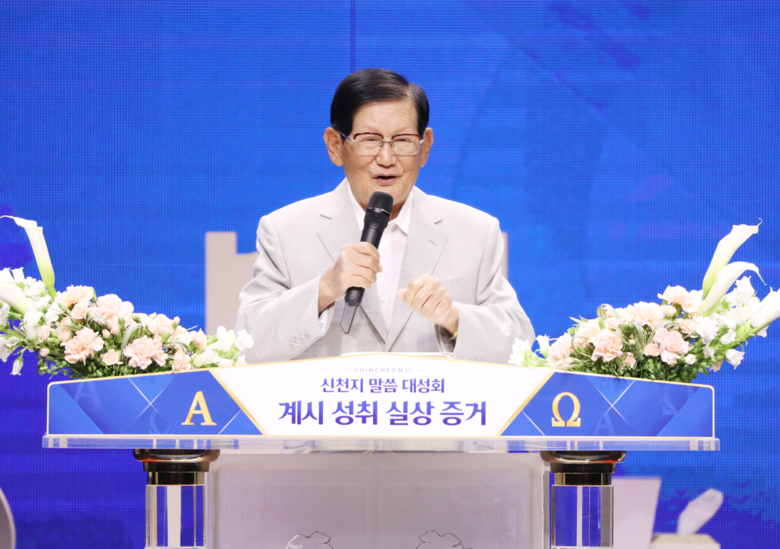 이 총회장은 이날 인천 송도 라마다 호텔에서 진행된 말씀대성회에서 목회자 포함 1300 여명을 대상으로 계시록 전반을 풀어주며 바른 신앙할 것을 촉구했다. 이 총회장은 "신천지는 기록한 예언뿐만 아니라 그 이룬 실체를 증거한다"며 "계시록을 제대로 배워 성도들을 가르쳐야 한다"고 참석한 목회자들에게 호소했다.