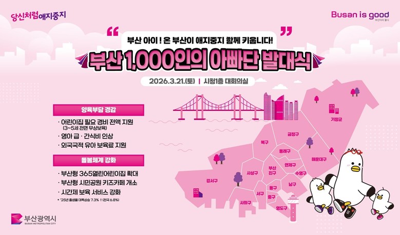 이어, “부산시는 앞으로도 엄마 아빠와 아이가 함께 행복하게 성장할 수 있도록 안전하고 좋은 양육 환경을 조성해 '아이 낳고 키우기 좋은 따뜻한 도시 부산'을 만드는 데 최선을 다하겠다”라고 덧붙였다.