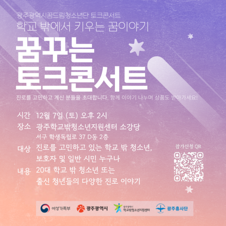 이번 토크콘서트는 20대 학교 밖 청소년과 성장 청년들이 광주지역 학교 밖 청소년과 보호자, 유관기관 관계자, 일반 시민들에게 자신들의 다양한 진로 이야기를 들려준다.
