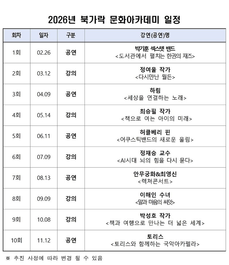 북가락 문화아카데미는 책(Book)·음악(歌)·공연(樂)을 도서관에서 함께 즐기자는 의미를 담은 정기 문화 프로그램으로, 도서관 이용자에게 다채로운 문화 향유 기회를 제공하고 휴식과 재충전의 시간을 마련하기 위해 기획됐다. 인문학, 여행, 과학, 자녀교육, 힐링 공연 등 다양한 주제로 진행된다.