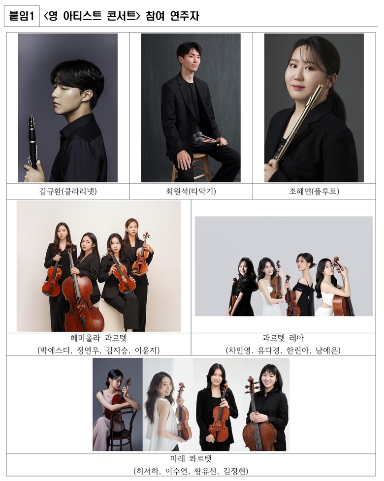 이어 18일(목) 오후 7시 30분에는 플루티스트 조혜연(강릉원주대 석사과정 재학), 콰르텟 레아(차민영, 유다경, 한린아, 남예은 이상 서울대 3.4학년 재학), 마레 콰르텟(허서하, 이수연, 황유선, 김정현 이상 서울대 졸업)이 뛰어난 연주를 선보인다.