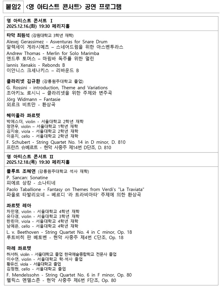 연주자는 강원대, 강릉원주대 음악대학 학과장 추천 우수 연주자와 2025 평창대관령음악제 대관령아카데미 시즌 교육프로그램 ‘실내악 멘토십 프로그램’ 멘토였던 바이올리니스트 기욤 쉬트르의 추천 실내악 팀이 참여한다.