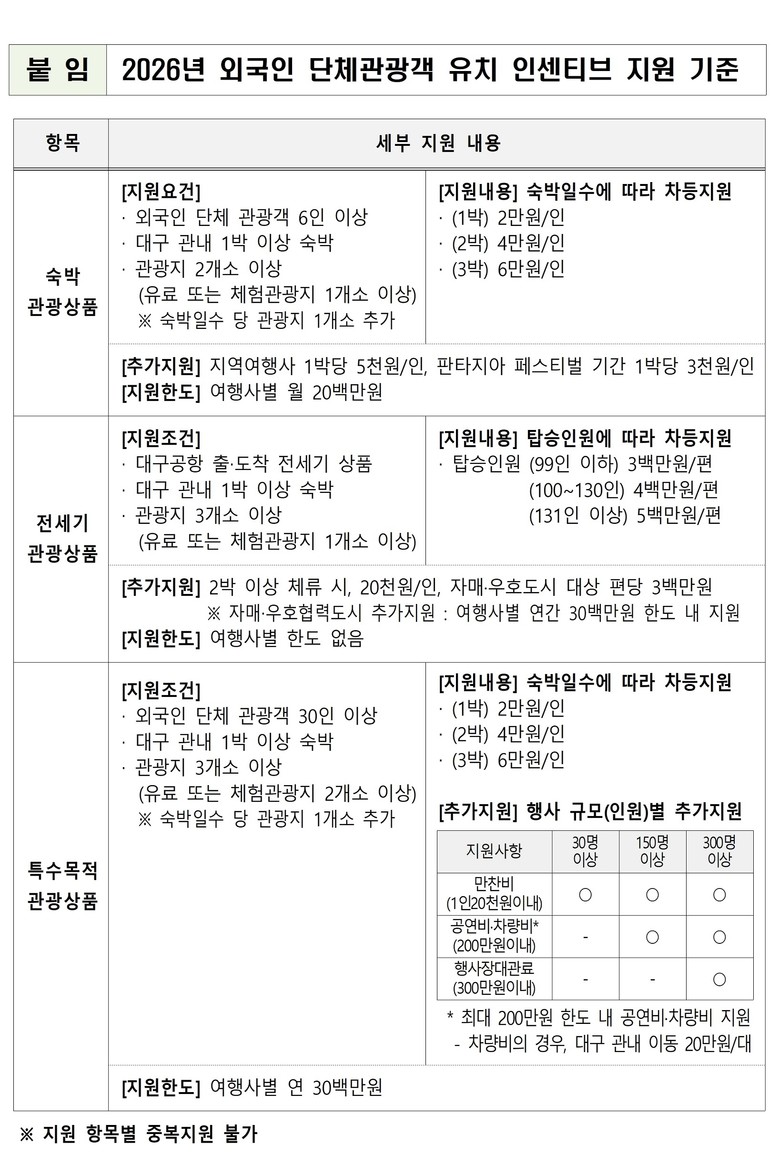 [대구 세계타임즈=한윤석 기자] 대구광역시는 급증하는 방한 외국인 관광 수요에 선제적으로 대응하고, 외국인 관광객의 체류 확대와 지역경제 활성화를 위해 ‘2026년 외국인 단체관광객 유치 인센티브 지원사업’을 본격 추진한다.