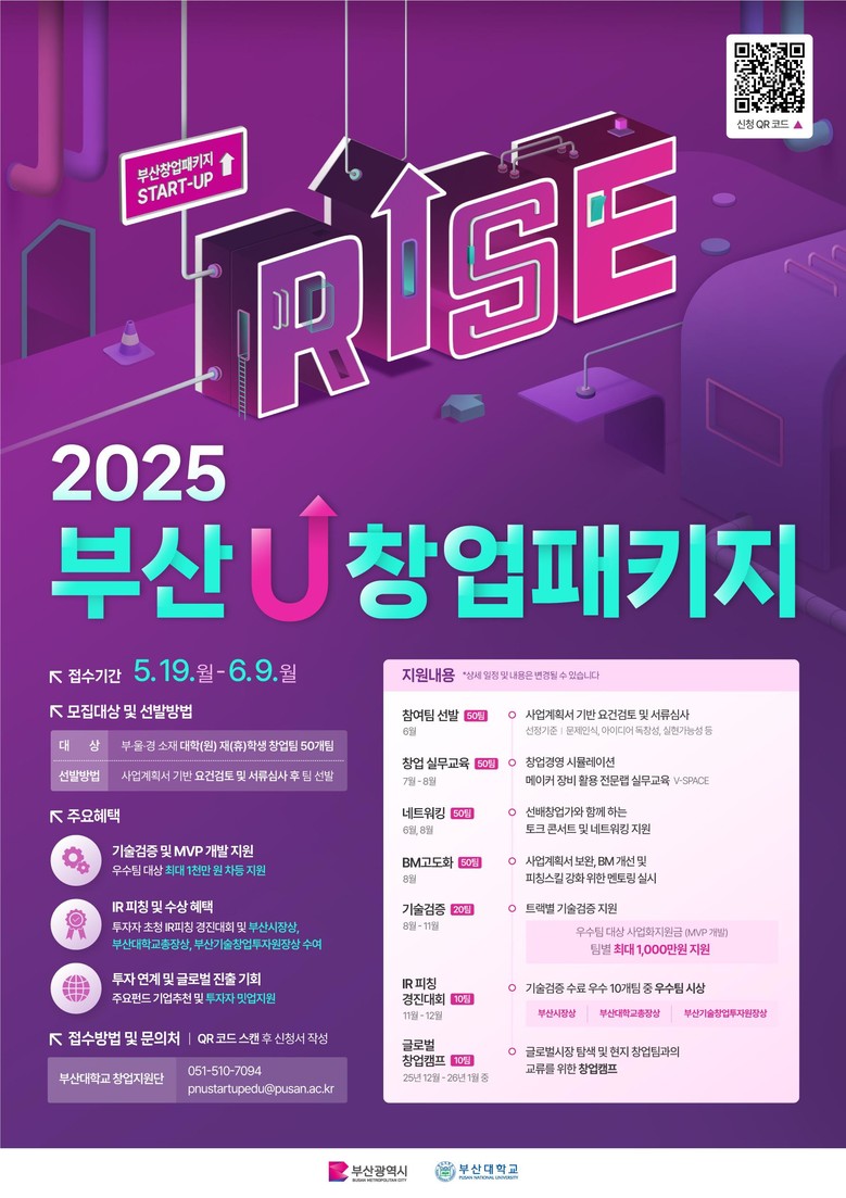 ◈ 우수 팀에게는 사업화 지원금 최대 1천만 원, 부산시장상(IR대상), 글로벌캠프 참가 등 다양한 인센티브 부여해 [부산 세계타임즈=이용우 기자] 부산시(시장 박형준)와 부산대학교(총장 최재원)는 기술기반 대학 창업 활성화를 위해 '지자체-대학-민간‧공공기관' 협력으로 추진하는 '2025년 부산유(U)창업패키지(이하 유(U)패키지)' 사업 참가자를 모집한다고 밝혔다.