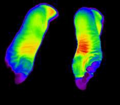 | ▲적외선으로 촬영된 수족냉증 환자의 발. 발끝의 온도가 다른 부위에 비해 현저히 낮을 것을 볼 수 있다. |