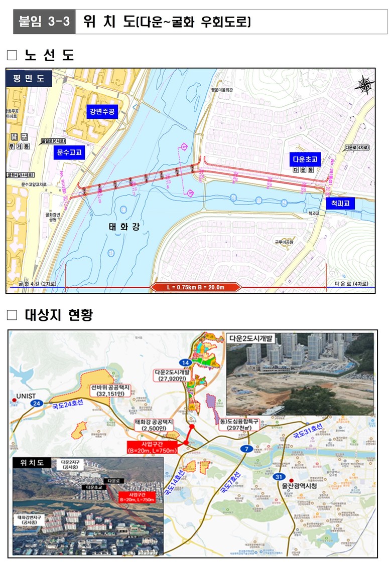 또 제5차 대도시권 교통혼잡도로 개선계획 대상사업은 ▲문수로 우회도로(L=2.71km, 1,360억 원) ▲여천오거리 우회도로(L=1.0km, 486억 원) ▲다운~굴화 우회도로(L=0.75km, 910억 원) 신설로 국가계획 반영을 위한 협의 절차를 진행 중이다.
