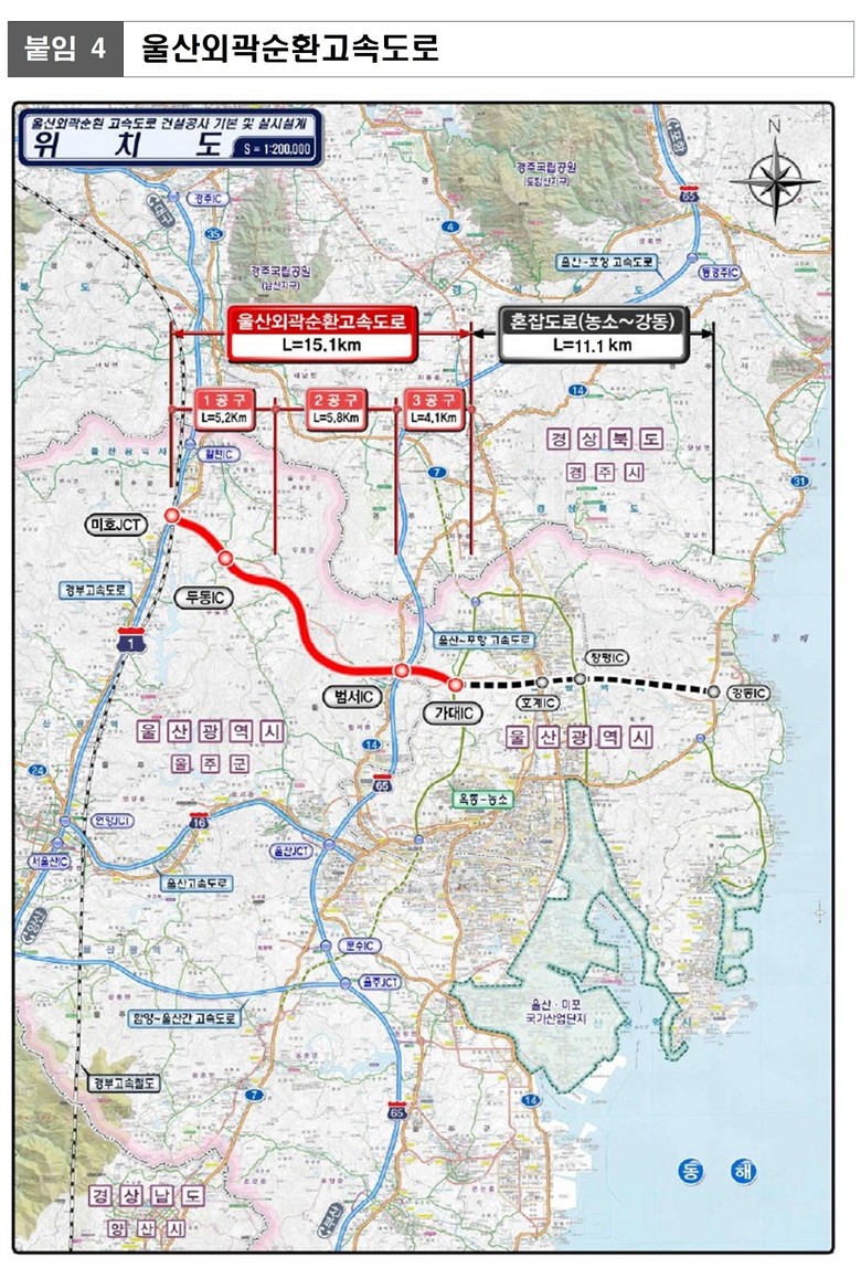 국가 시행 사업으로는 ▲울산외곽순환고속도로(15.1㎞, 4차로) ▲농소~외동 국도 건설(5.9㎞, 4차로) ▲울주 범서~경주시계 도로(6.43㎞, 4차로) 등 7개 사업이 포함돼 있으며, 해당 사업들은 사업계획에 따라 보상과 공사가 추진된다.