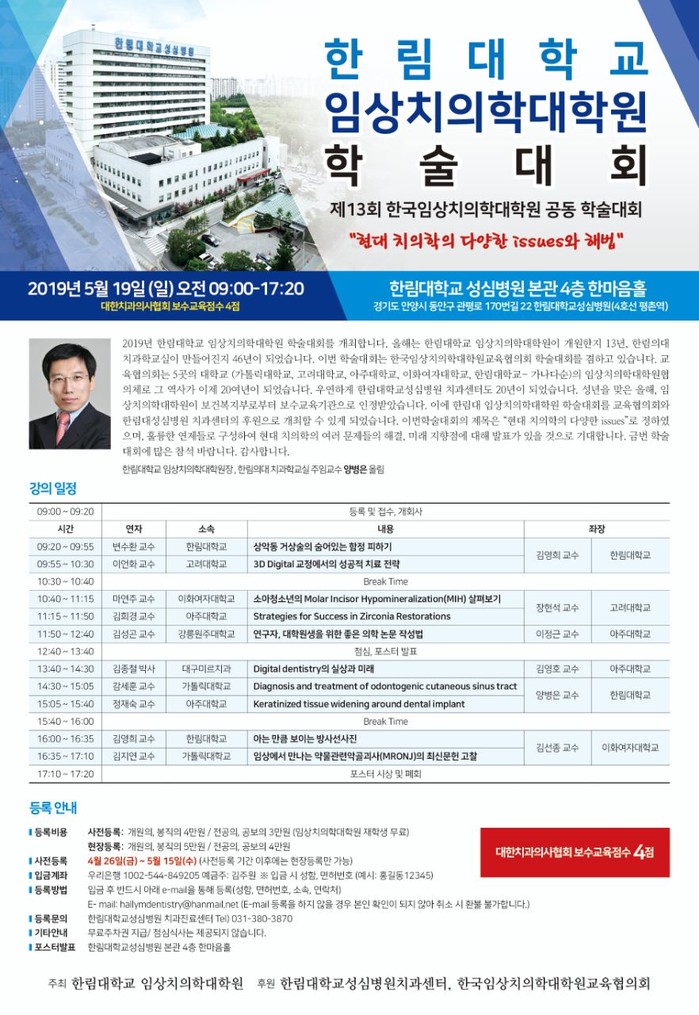 학술대회 사전등록은 4월 26일(금)~5월 15일(수)까지 이메일(hallymdentistry@daum.net)로 가능하며, 사전등록비는 개원의·봉직의 4만원, 전공의·공보의 3만원이다. 참가자에게는 대한치과의사협회 보수교육점수 4점이 주어지며, 문의는 한림대학교성심병원 치과센터 전화(031-380-3870)로 하면된다.