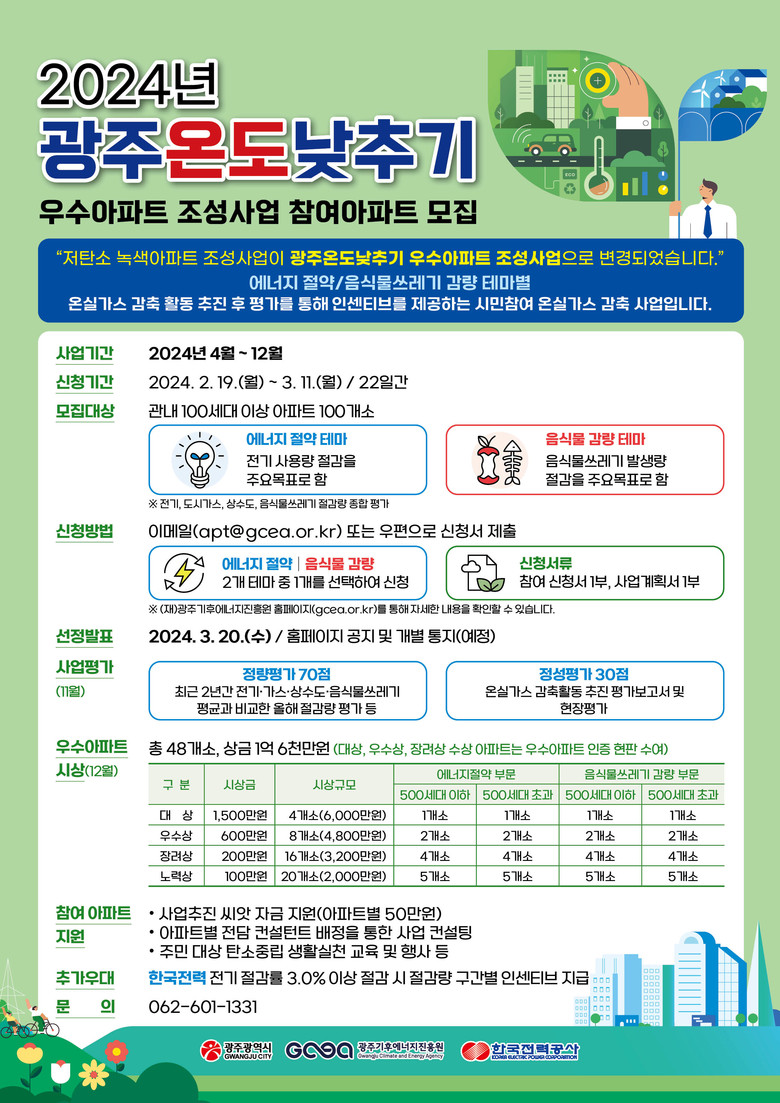 모집 대상은 광주지역 100세대 이상 공동주택 100곳이다. 온실가스 감축 활동에 따른 종합적인 평가를 통해 우수아파트 48개소를 선정해 ▲대상(4개소) 1500만원 ▲우수상(8개소) 600만원 ▲장려상(16개소) 200만원 ▲노력상(20개소) 100만원을 각각 지급할 계획이다.